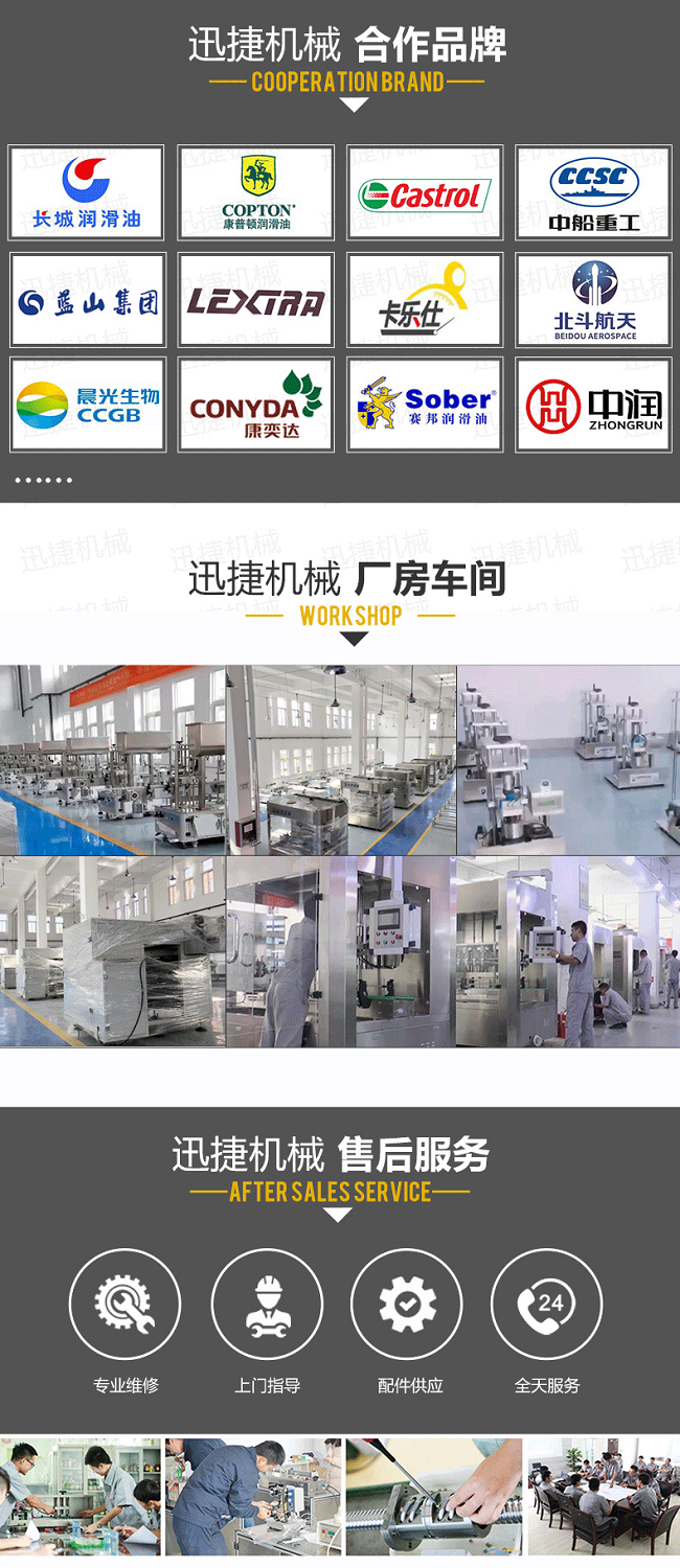 該機是我司很新研制的潤滑油定量灌裝機,設備集光、電、氣于一體,由PLC配合人機界面(觸摸屏)控制,從進瓶、定位、灌裝、出瓶等動作均全自動完成。采用直流式灌裝,與物料接觸部分均采用出色不銹鋼和食品級材料制成,符合食品衛(wèi)生要求;自動化程度高,性能穩(wěn)定,生產(chǎn)速度快,灌裝準確,操作簡單、調整方便,適應性強等特點。