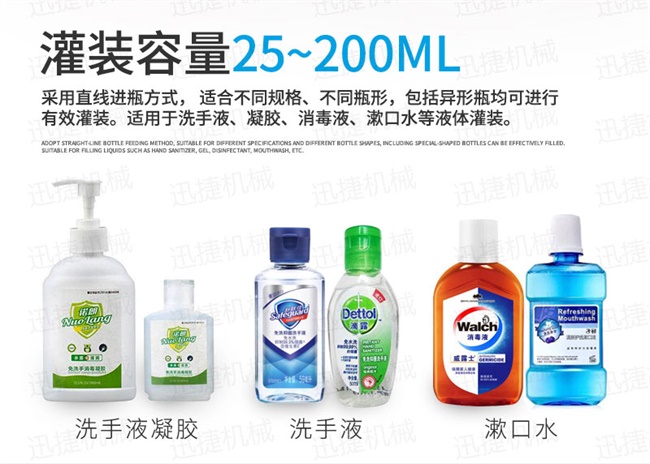 全自動(dòng)凝膠生產(chǎn)線適用于消毒凝膠、免洗手洗手液、免洗手消毒凝膠、消毒液、84消毒液、醫(yī)用酒精、75%酒精消毒液、75度酒精、消毒水、殺菌消毒劑、醫(yī)用酒精、碘酒、次氯酸鈉、劑、醫(yī)用乙醇消毒液、瓶裝消毒劑等產(chǎn)品,有多頭全自動(dòng)消毒液灌裝機(jī)和封箱機(jī)、貼標(biāo)機(jī)、打包機(jī)、噴碼機(jī)等配套設(shè)備組成,實(shí)現(xiàn)消毒液自動(dòng)灌裝,自動(dòng)旋蓋,自動(dòng)貼標(biāo),從灌裝、到成品的全部過程