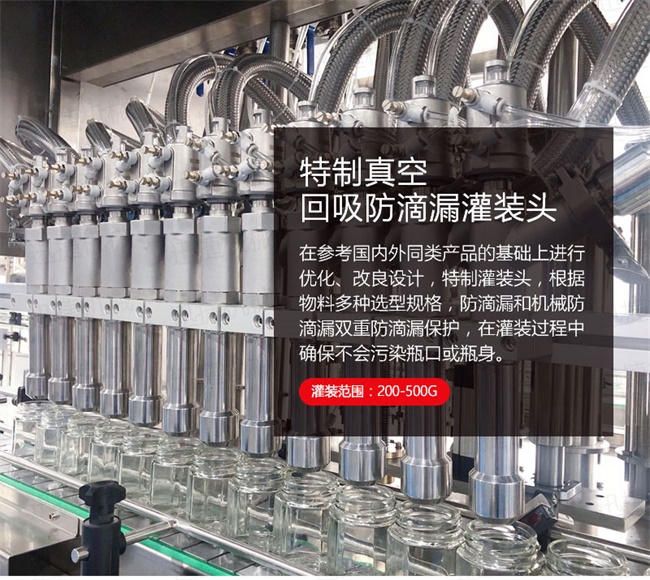 3、灌裝機(jī)采用橫推料的方式,大大縮短了下料斗到灌裝頭的距離,提高了灌裝速度,更重要的是解決了含油量大的物料在灌裝過(guò)程中出現(xiàn)的有些瓶油多,有些瓶醬多的灌裝難題,大大提高了灌裝精度。