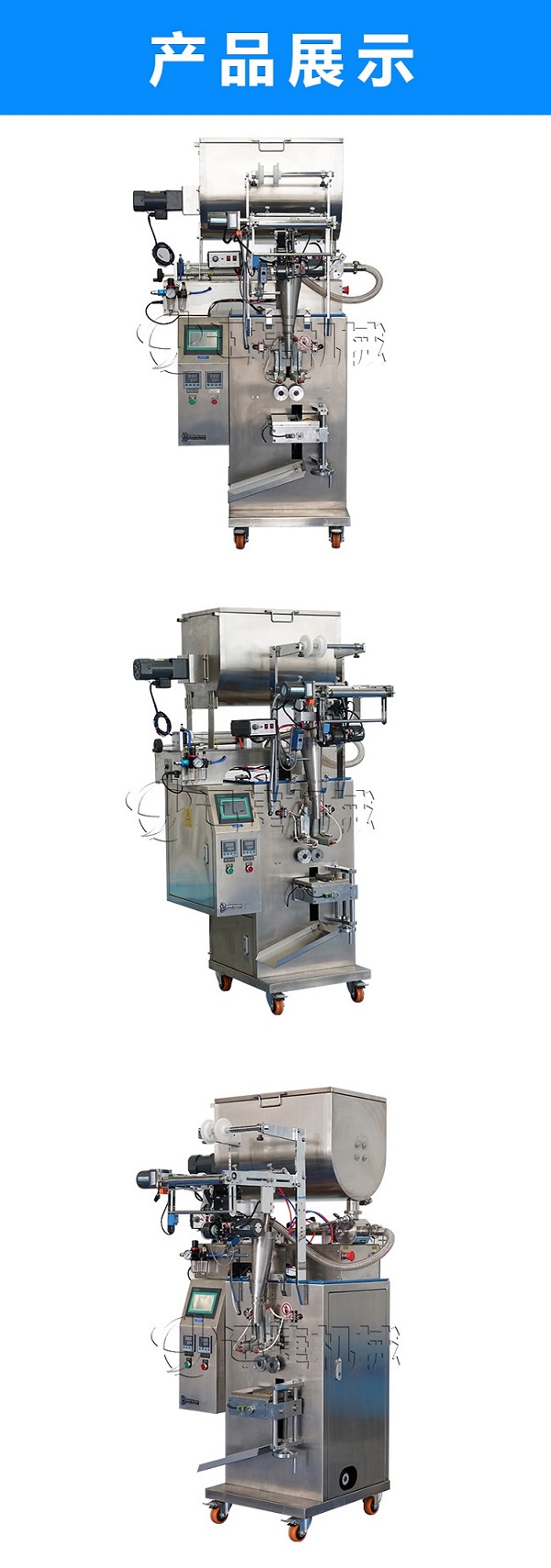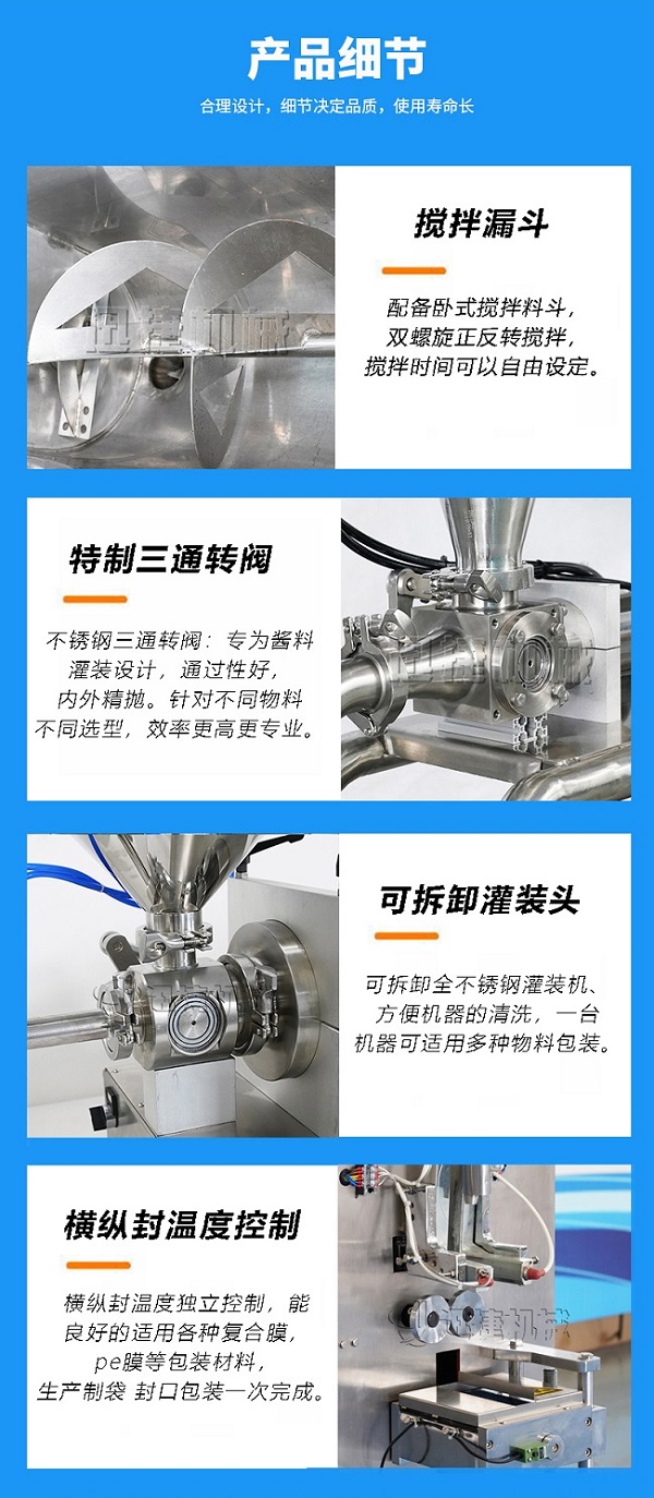該包裝機適用于包裝芝麻醬、食用油、洗發(fā)液、調(diào)味汁、油脂、脂膏、化妝品等產(chǎn)品,將其灌入袋內(nèi),能適合各種粘度的產(chǎn)品。該機具有快速、精確、經(jīng)濟和實用的優(yōu)點。雙系統(tǒng)設置,可實現(xiàn)醬與油的分流包裝。