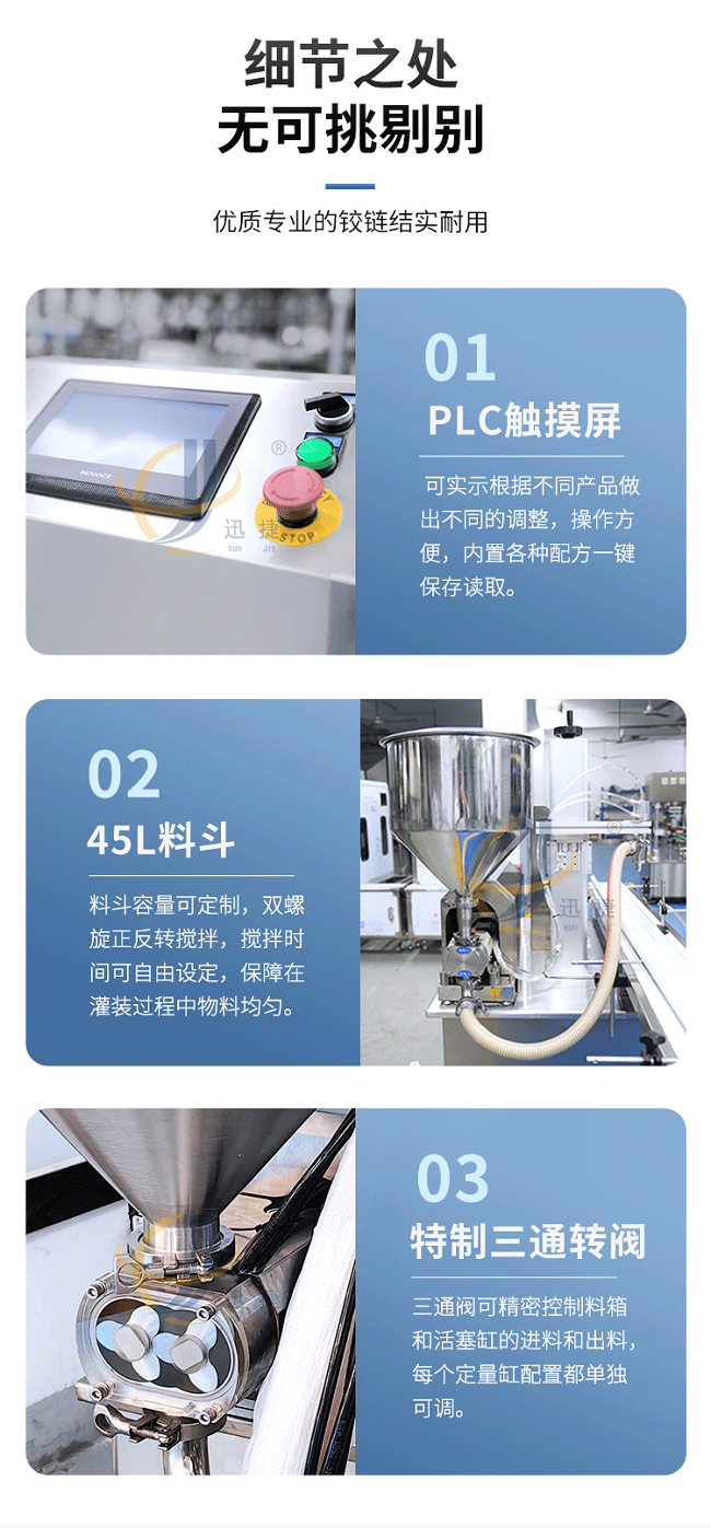我公司新研發(fā)五極醬料灌裝機(jī),五極分為極快,極簡(jiǎn),極穩(wěn),極廣,極準(zhǔn),廣泛適用于各種膏霜、蜂蜜、洗衣液、洗發(fā)水、半流體、蜂蜜、醬料以及各種粘稠物料,該產(chǎn)品支持定制,選用306不銹鋼材質(zhì),灌裝精度高,防止滴漏,選用plc觸屏智能控制,防滴漏防拉絲,突破傳統(tǒng)的灌裝方式,可根據(jù)瓶子高度調(diào)整灌裝頭高度,采用防滴漏設(shè)計(jì),灌裝時(shí)不滴不漏。