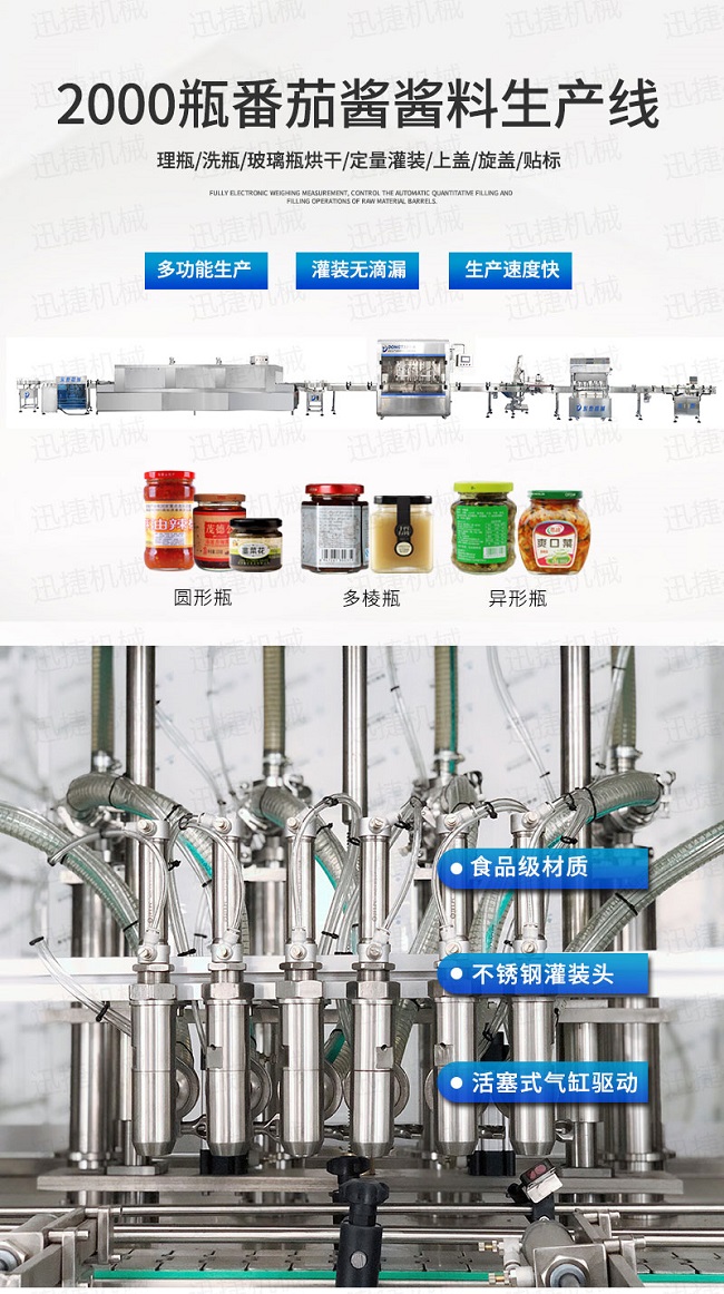 番茄醬,為番茄的醬狀濃縮制品,以成熟紅番茄為原料,經(jīng)破碎、打漿、去皮和籽后濃縮、罐裝、殺菌制成。成品為鮮紅色的醬狀體,具有番茄的特有風(fēng)味。尤其是家里有小孩的,都喜歡配著薯?xiàng)l或者炸雞吃,味道真是美味極了,我們平時會在超市里買到瓶裝的番茄醬,看起來干凈衛(wèi)生,更容易儲存;那么為了滿足市場需求,我們公司推出了番茄醬灌裝機(jī)設(shè)備,不僅灌裝速度快,而且還能保證產(chǎn)品的質(zhì)量和衛(wèi)生安全,下面就由小編為你詳細(xì)介紹一下這款自動化番茄醬灌裝機(jī)的特點(diǎn)吧!