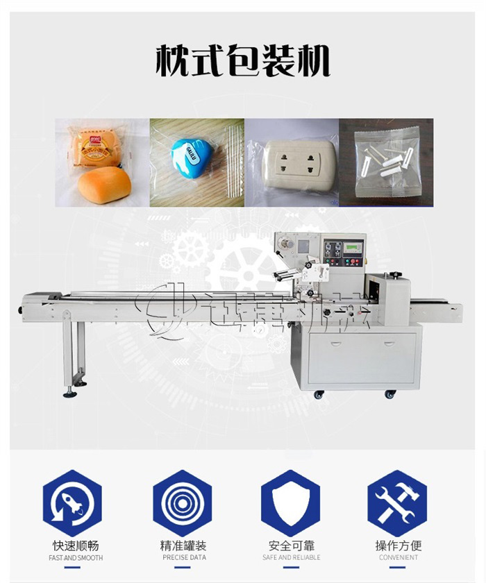 該包裝機(jī)為全自動枕式包裝機(jī),適用于各種固型產(chǎn)品的包裝,如食品類(方便面、面包、漢堡、餅干、雪糕、冷凍食品),日用品(肥皂、餐巾紙),五金配件,機(jī)械零件(軸承),橡膠制品(輪胎)等產(chǎn)品的枕式包裝。